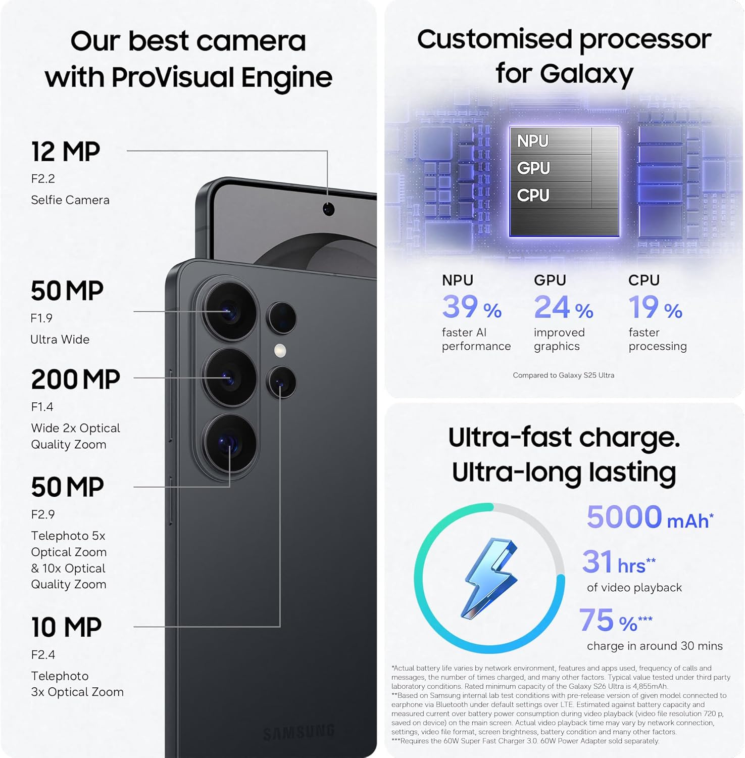 - ENHANCED AI PERFORMANCE: Running on the Snapdragon 8 Elite Gen 5 processor and built with improved NPU, GPU and CPU, the Galaxy S26 Ultra AI phone delivers boosted efficiency and function; To maximise output and minimise wasted time⁴